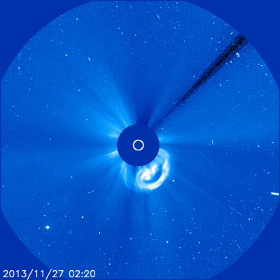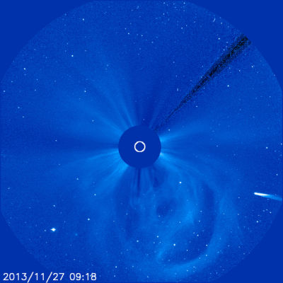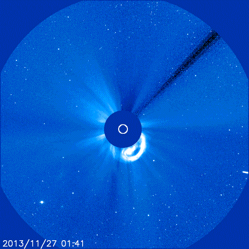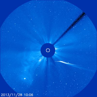 Spiegel online:“ Am vergangenen Donnerstag war "Ison" nur knapp einen Sonnendurchmesser entfernt am Zentralgestirn vorbeigeflogen. Dabei war der Komet extremen Temperaturen von schätzungsweise 2000 bis 3000 Grad Celsius ausgesetzt - und verlor offenbar seine komplette Gashülle. |