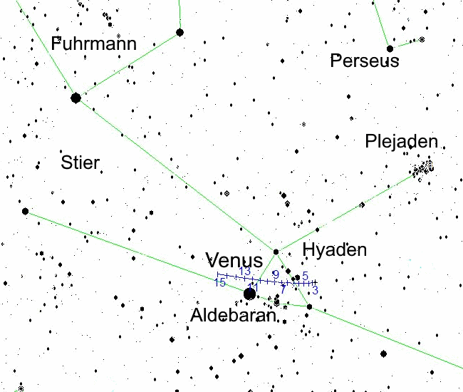 am 3. Juli beginnt Venus ihren Weg durch den offenen Sternhaufen der Hyaden. Wenn Anfang Juli die Hyaden aufgehen (3:40), ist es bereits zu hell, um einzelne Sterne des Sternhaufens erkennen zu können.