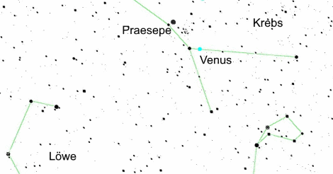 Das vorletzte Schauspiel, das Venus in diesem Jahr zu bieten hat, ist die Begegnung mit dem offenen Sternhaufen Praesepe, oder auch Messier 44 im Sternbild Krebs. Die geringste Entfernung zu M 44 hat der helle Planet am Morgen des 14. September. Dann steht Venus nur 2,5 Grad südöstlich des Sternhaufens. Mit der Beobachtung sollte bis 4 Uhr gewartet werden, denn dann steht Praesepe bereits 10 Grad über dem Horizont und es ist noch dunkel genug, um Praesepe im Feldstecher erkennen zu können. |