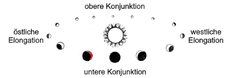 Venus ist ein innerer Planet, das bedeutet, Venus umkreist die Sonne innerhalb der Erdbahn. Sie kann also von der Erde aus gesehen, der Sonne nicht gegenüberstehen (Opposition). Venus erreicht lediglich einen maximalen Abstand von 47 Grad.