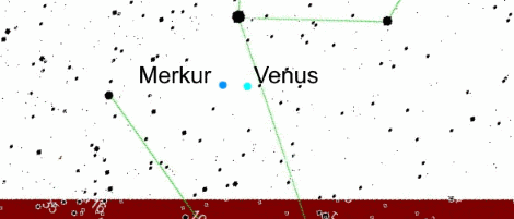 Im Mai läuft Venus scheinbar auf die Sonne zu und passiert dabei den innersten Planeten Merkur. Am Abend des 22. Mai steht Venus in Konjunktion mit Merkur und ist nur 1,3 Grad westlich von ihm zu sehen. Ab 21:30 Uhr wird es dunkel genug, um Merkur zu sehen. Beide Planeten stehen dann nur noch 9 Grad über dem Horizont. |