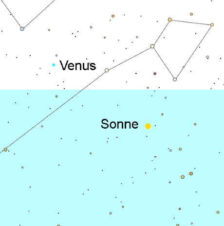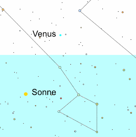 Venus steht zu dieser Zeit 10 Grad nördlich von der Sonne. Das heißt, sie geht abends nach der Sonne unter und morgens vor ihr auf. |