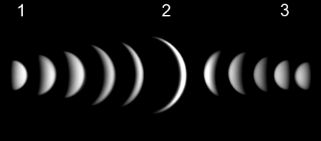 Im Bild rechts ist die Phase bei 2 kurz vor der unteren Konjunktion zu beobachten. |