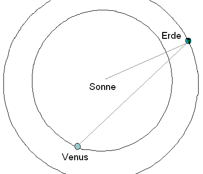 Die Venus ist, genauso wie Merkur, ein innerer Planet. Sie zieht ihre Bahn um die Sonne innerhalb der Erdbahn. Die Venus ist der Sonne also näher als die Erde.