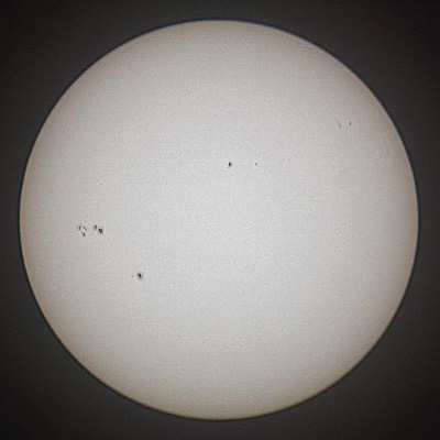 Betrachtet man die Sonne im weißen Licht, kann man dunkle Flecken auf der Photosphäre sehen. Dazu ist aber ein speziell ausgerüstetes Fernrohr notwendigen. Es müssen 99,999% des Sonnenlichts ausgefiltert werden, was vor dem Objektiv erfolgen sollte, um das ganze Fernrohr vor der Erhitzung zu bewahren. Ein Filter vor dem Okular erhitzt sich stark und kann springen. |
