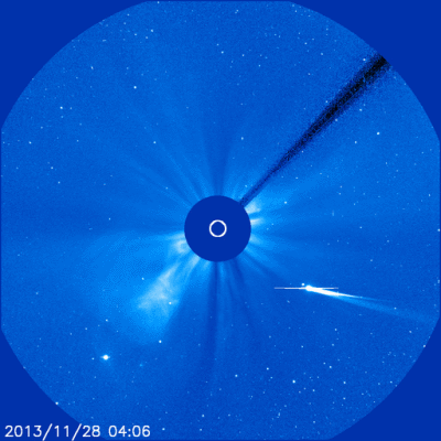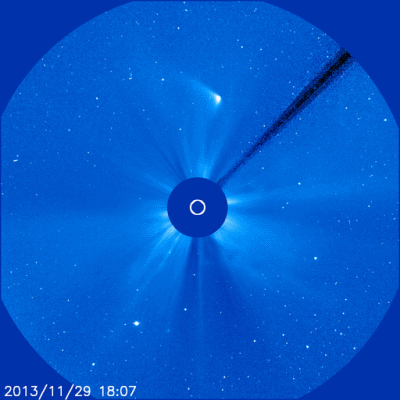 Spiegel online:“ Am vergangenen Donnerstag war "Ison" nur knapp einen Sonnendurchmesser entfernt am Zentralgestirn vorbeigeflogen. Dabei war der Komet extremen Temperaturen von schätzungsweise 2000 bis 3000 Grad Celsius ausgesetzt - und verlor offenbar seine komplette Gashülle. |