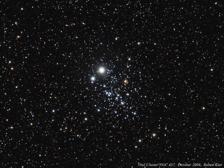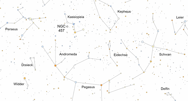 Zu Unrecht ist der Eulennebel nicht sehr bekannt, denn er bietet im Fernrohr einen sehr schönen Anblick. Schon im einen 8 zölligen Teleskop leuchten die beiden Hauptsterne Phi Cassiopeiae und HD 7902 wie Diamanten auf einer Wiese von schwächeren Sternen.