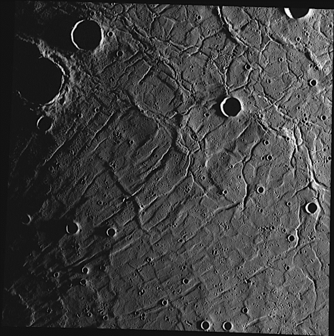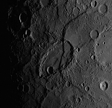 Die glatten Ebenen des Merkurs sind nicht dunkel wie die „Mondmeere“. Insgesamt sind sie anscheinend auch kleiner und weniger zahlreich. Sie liegen alle auf der Nordhalbkugel im Umkreis des Caloris-Beckens. Ihre Gattungsbezeichnung ist Planitia, lateinisch für Tiefebene. |