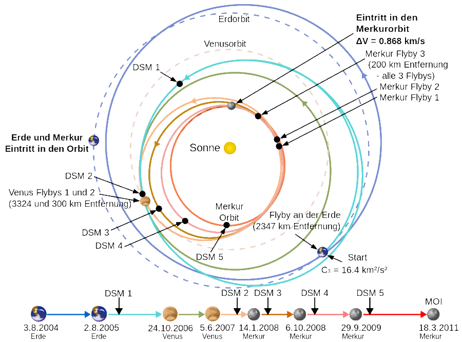 Wir wollen deshalb den Weg der Raumsonde MESSENGER zu Merkur verfolgen und die Ergebnisse ansehen.
