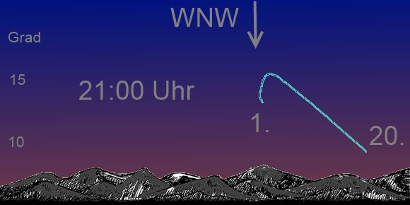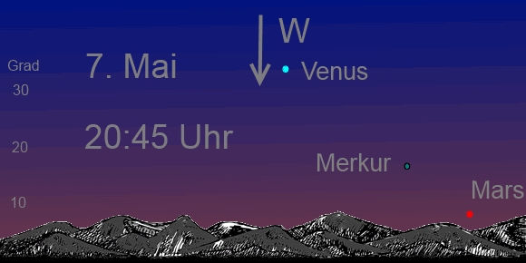 In der ersten Hälfte des Monats ergeben sich gute Sichtbedingungen für den sonnennächsten Planeten, denn die Ekliptik steht abends im Frühling steil über dem Horizont. Merkur entfernt sich von der Sonne, dabei nimmt seine Helligkeit ab, denn der beleuchtet Teil kleiner. Dafür hat Merkur am 7. Mai dann die größte östliche Elongation erreicht. Das heißt er hat einen Abstand von der Sonne von 21 Grad. Dann ist der Planet abends ab 20:45 Uhr tief im Südwesten zu erkennen. Es ist um diese Zeit dunkel genug, um den 0,5mag hellen Merkur in 20 Grad Höhe und den 1,5mag hellen Mars in 6 Grad über dem Horizont ausfindig zu machen. |
