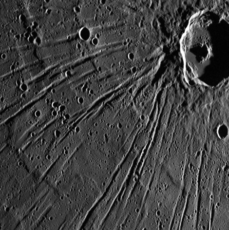 Bis zu mehrere hundert Kilometer lange und 2 km hohe Steilstufen, die damit die größten Höhenunterschiede auf dem Merkur aufweisen. Sie ziehen sich in sanften Windungen quer durch Ebenen und Krater. Es handelt sich um Überschiebungen der Kruste. Die dadurch seitlich versetzten Kraterteile zeigen an, dass sie auch horizontal gegeneinander verschoben wurden. Diese Überschiebungen sind vermutlich durch ein Schrumpfen des gesamten Planeten entstanden. |