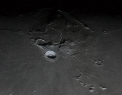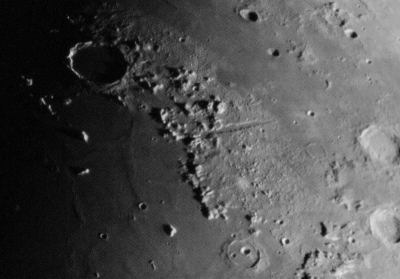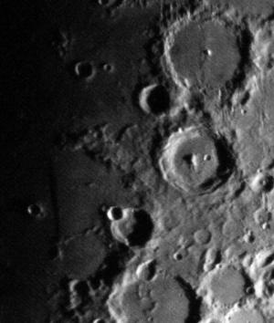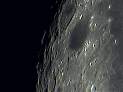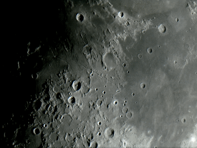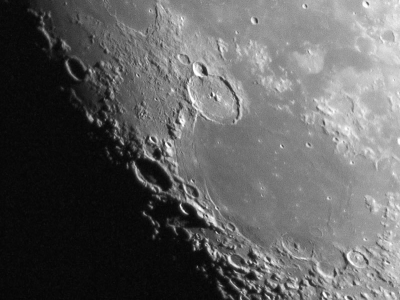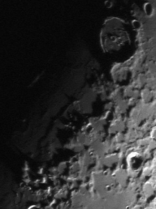 Beginnen wir mit der Beobachtung kurz nach Neumond – also auf der Mondoberfläche von Ost nach West. An der Licht-Schatten Grenze (Terminator) geht die Sonne gerade auf und wirft lange Schatten, die für einen guten Kontrast sorgen. |