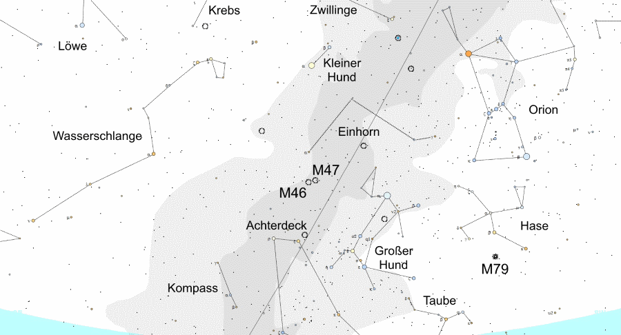 Die beiden offenen Sternhaufen stehen weit im Süden, etwa auf der Höhe (Deklination) von Sirius. Deswegen erreichen sie Mitte Februar kurz nach 22 Uhr ihre maximale Höhe von nur 27 Grad über dem Horizont. |