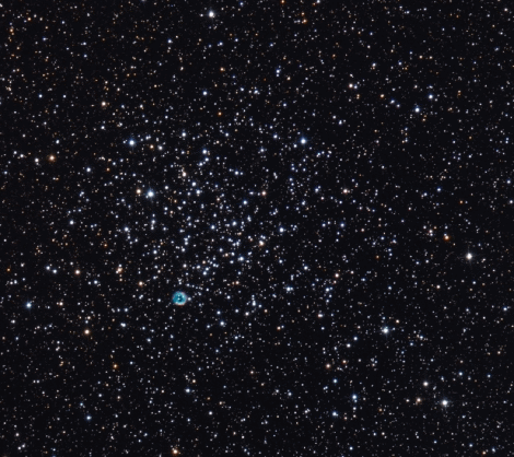 Auffällig ist der planetarische Nebel (NGC2438, Calabash Nebel), der sich zufällige vor dem offenen Sternhaufen befindet. Er hat „nur“ eine Entfernung von 2 900 Lichtjahren. Verursacher ist ein weißer Zwerg im Zentrum des Nebels. Der Zentralstern ist nur auf lange belichteten Aufnahmen zu sehen, denn er hat eine Helligkeit von 17,7 mag. Messier 46 könnte als ältere Schwester von Messier 47 angesehen werden, da Messier 46 etwa 300 Millionen Jahre und Messier 47 nur 80 Millionen Jahre alt ist. Daher haben die massereicheren und helleren Sterne in Messier 46 ihr kurzes Leben schon beendet und sind nicht mehr zu sehen, so dass die meisten Sterne, die in diesem älteren Sternhaufen, die zu sehen sind, rot und kühler erscheinen. |