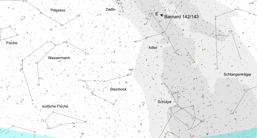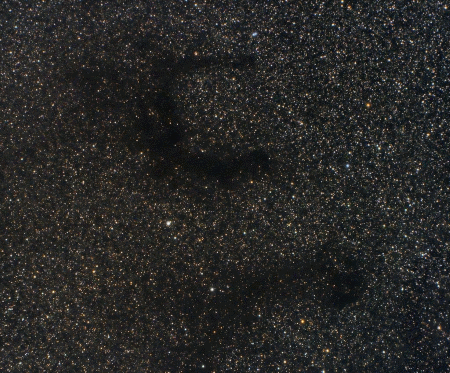 Ein Dunkelnebel besteht aus Materie, die das Licht dahinterliegender Objekte absorbieren. Sie lassen sich beobachten, wenn sie Hintergrundsterne abdunkeln oder völlig ausblenden, oder wenn sie Teile von Emissions- oder Reflexionsnebeln verdecken (zum Beispiel Pferdekopfnebel). |
