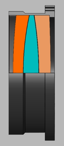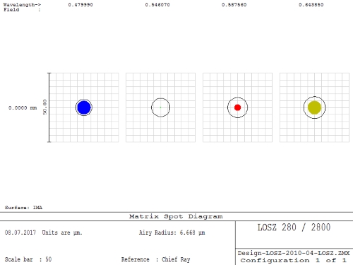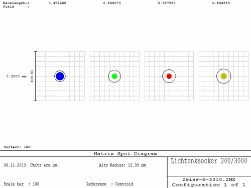 Das Objektiv des neue Refraktor ist ebenfalls ein Apochromat. Durch die neuen niedrig dispersiven Glassorten kann jetzt das Design des Objektivs viel entspannter sein. Die Krümmungsradien sind viel größer und damit wird das Objektiv viel toleranter bezüglich der achsialen und radialen Justage der Linsen. |