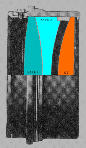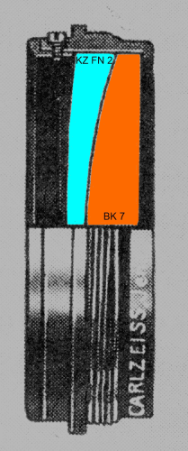 Von 2009 bis zum Abbau des Teleskops wurde ein B-Objektiv verwendet. Dieses Triplett besteht aus zwei Flint- und eine Kronglas Linse. Es ist sehr anspruchsvoll durch die großen Krümmungen der Glasflächen und damit empfindlich bezüglich achsialen und radialen Positionen der Gläser. Mit der erforderlichen Genauigkeit von ca 5 Mikrometer ist die Objektivfassung extrem anspruchsvoll. |
