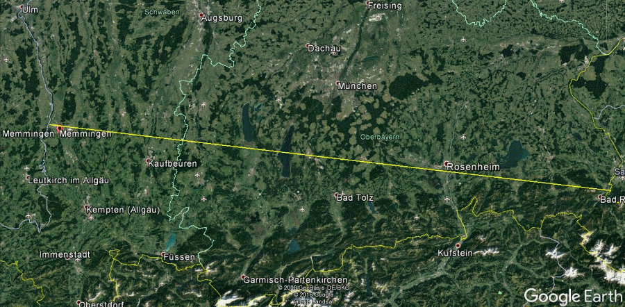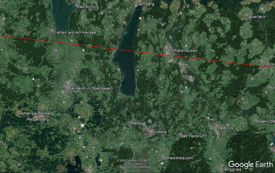 | Weilheim befindet sich knapp im Gebiet der Bedeckung. Da Eberfing dicht an einer streifenden Aldebaran Bedeckung liegt, sollte man auf einen schnellen Austritt vorbereitet sein. | ||