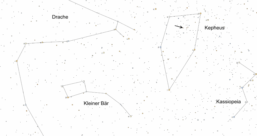 Die nächste Bedeckung durch VV Cephei A findet vom 4.8.2017 an statt. Dabei sinkt die scheinbare Helligkeit des Systems von 4,8 mag auf 5,4 mag. Im Mai 2019 ist die Verfinsterung zu Ende und Helligkeit steigt wieder auf 4,8 mag. |