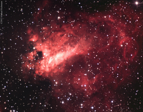 Der 6,6 mag helle Omeganebel hat eine Ausdehnung von 11 Bogenminuten und eine wesentlich höhere Flächenhelligkeit als M 16. Seine Entfernung beträgt 5500 Lichtjahren. Hier hilft ein Nebelfilter (UHC), die feinen Strukturen zu erkennen.