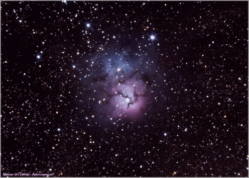 Ist ein heller (6,3 mag) Gasnebel mit einem scheinbaren Durchmesser von 28 Bogenminuten. Durch sein Aussehen hat er den Namen Trifidnebel erhalten, denn er wird von Dunkelwolken dreigeteilt. Der „Mercedes-Stern“, der als Dunkelnebel den Gasnebel teilt, der Im Teleskop bei schwacher Vergrößerung mit Nebelfilter (UHC) besser zu erkennen ist. Auffällig ist der Mehrfachstern im Zentrum des Nebels. Die Komponenten A (7 mag) und C (8,8 mag) haben einen Abstand von 14,6 Bogensekunden. Dieser Stern erweist sich bei höherer Vergrößerung als dreifach Sternsystem mit der zusätzlichen Komponente B (10,6 mag), welche von A 5,4 Bogensekunden getrennt ist. Ab 12“ Öffnung können die restlichen beiden Komponenten des Mehrfachsternsystems (5-fach System) wahrgenommen werden.