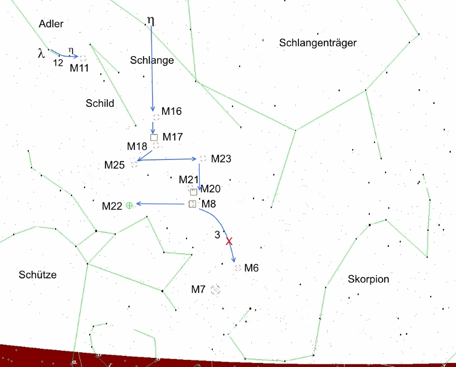 Von M 22 führt unser Weg zunächst zurück zu M 8, dann 50 Bogenminuten darüber hinaus (in Rektaszension) und 8 Grad nach Süden (in Deklination) zum offenen Sternhaufen M 6. Wir befinden uns jetzt im Sternbild Skorpion. Wir schlagen einen leicht gekrümmten Weg von M 21 über M 20 hinaus über den 4,6 mag hellen 3 Sagittarii zu M 6. Unterwegs überqueren wir Sagittarius A, ein rotes X markiert die Position.