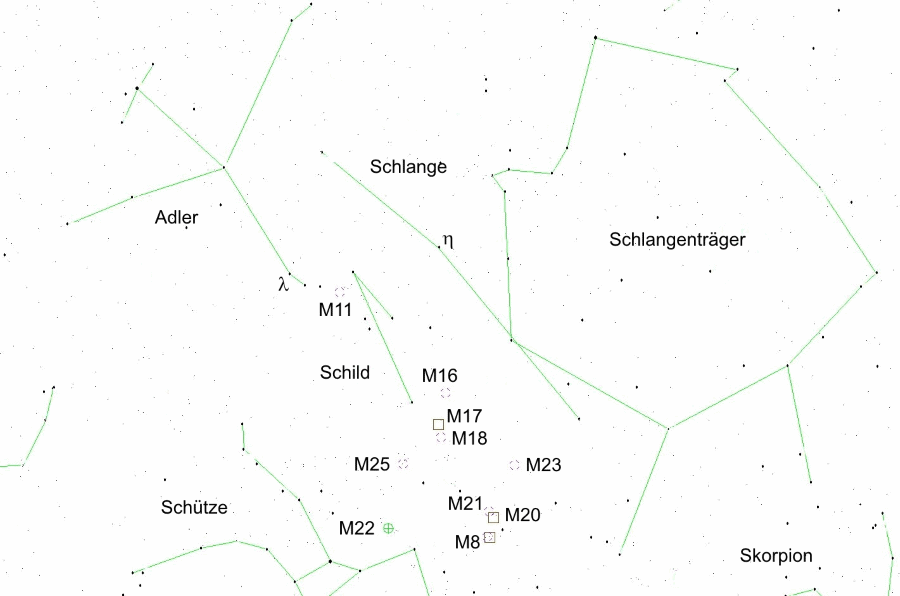 Westlich (rechts) vom Sternbild Schild steht das große Sternbild des Schlangenträgers und der Schlange. Rechts oberhalb von M 11 steht der 3,2 mag helle eta Serpentis (Schlange).