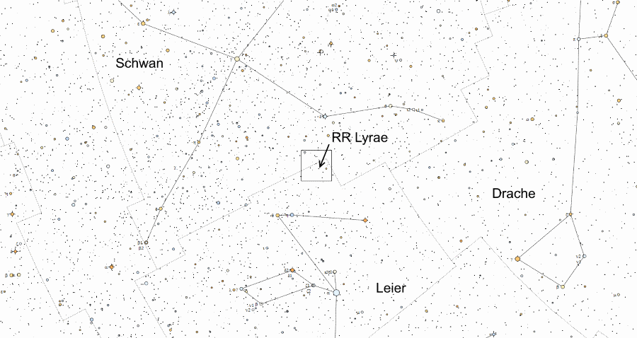RR Lyrae selbst ist mit einer Helligkeit von 7,9 mag recht unscheinbar im Sternbild Leier, dicht an der Grenze zum Sternbild Schwan. Er scheint mit der rund der 50-fachen Leuchtkraft der Sonne in einer Entfernung von 940 Lichtjahren. Da RR Lyrae ein Pulsationsveränderlicher ist, ändert sich der Spektraltyp von A5 nach F7 (d.h. von bläulich nach grünlich). Die Helligkeit schwankt zwischen 7,1 mag im Maximum und 8,2 mag im Minimum mit einer Periode von 13 Stunden und 36 Minuten. Die Minimumshelligkeit von 8,2 mag erlaubt es diesen Veränderlichen, mit etwas Übung, auch mit dem Feldstecher zu beobachtet. |