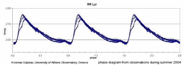 Bei den RR Lyrae Sternen liegt die Pulsationsperiode unter 1,5 Tagen. Die Helligkeitsamplituden betragen bis zu 2 Magnituden und der Spektraltyp A bis F. Durch Beobachtungen haben Astronomen eine Schwankung des Helligkeitsmaximums beobachtet. (siehe Lichtkurven unten) Entdeckt wurde dieser Effekt von dem russischen Astronomen Sergey Blazhko (1870-1956). |