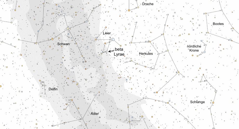 Beta Lyrae ist ein System aus mehreren Sternen. Hier entstand aus der Urwolke nicht nur ein Stern (und Planeten, wie bei uns) sondern mehrere Sterne. Er trägt auch den arabischen Namen Sheliak (Schildkröte) und ist ein veränderlicher Stern. Seine Helligkeit schwankt periodisch in 12,9 Tagen, die Entfernung von Sheliak beträgt etwa 900 Lichtjahre. |