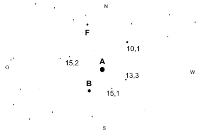 Die einzelnen Komponenten des Doppelsterns sind A, B und F. |