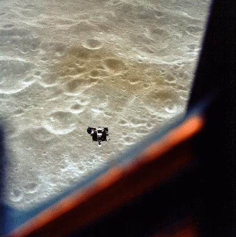Bild rechts: Das LEM vom Mutterschiff beim Abstieg zum Mond