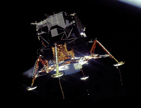 Im Mondorbit stiegen zwei Astronauten in die Mondfähre um, koppelten ab und begannen den Abstieg zum Mond. Der dritte Astronaut blieb an Bord des Mutterschiffs und umkreiste allein den Mond. |