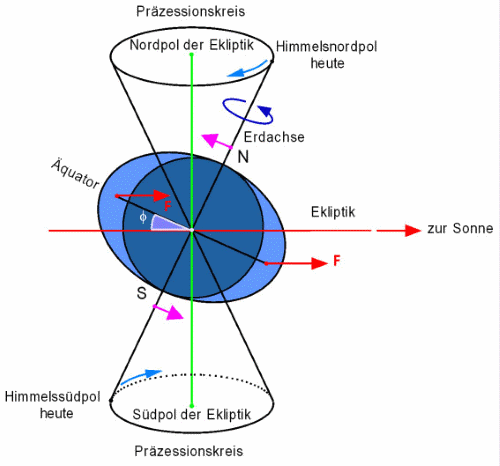 Die Erdachse ist im Moment um 23,3 Grad gegenüber der Ekliptik geneigt und beschreibt die Bewegungen eines Kreisels im Schwerefeld der Sonne.