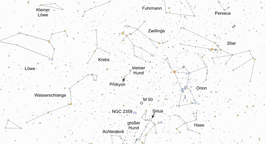 Der Sternhaufen befindet sich im Sternbild Einhorn, einem Gebiet ohne helle Sterne in der Nähe. Deshalb dienen Sirius (alpha Canis Majoris) und Prokyon (alpha Canis Minoris) als Hilfssterne zum Aufsuchen. M50 liegt auf der Verbindungslinie Sirius – Prokyon, ein Drittel der Strecke von Sirius entfernt. |