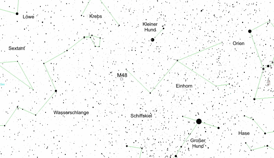 Messier 48, oder auch NGC 2548, kann unter guten Sichtbedingungen mit dem blosem Auge beobachtet werden, denn er hat eine Helligkeit von 5,8 mag. Sichtbar bis 13 mag sind etwa 80 Sterne, wobei der hellste Stern mit 8,2 mag leuchtet. Seine Ausdehnung liegt bei etwa 54 Bogenminuten was bei einer Entfernung von 2000 Lichtjahren etwa einem Durchmesser von 34 Lichtjahren entspricht. Bei dieser Größe ist Messier 48 ein gutes Objekt für den Feldstecher. |