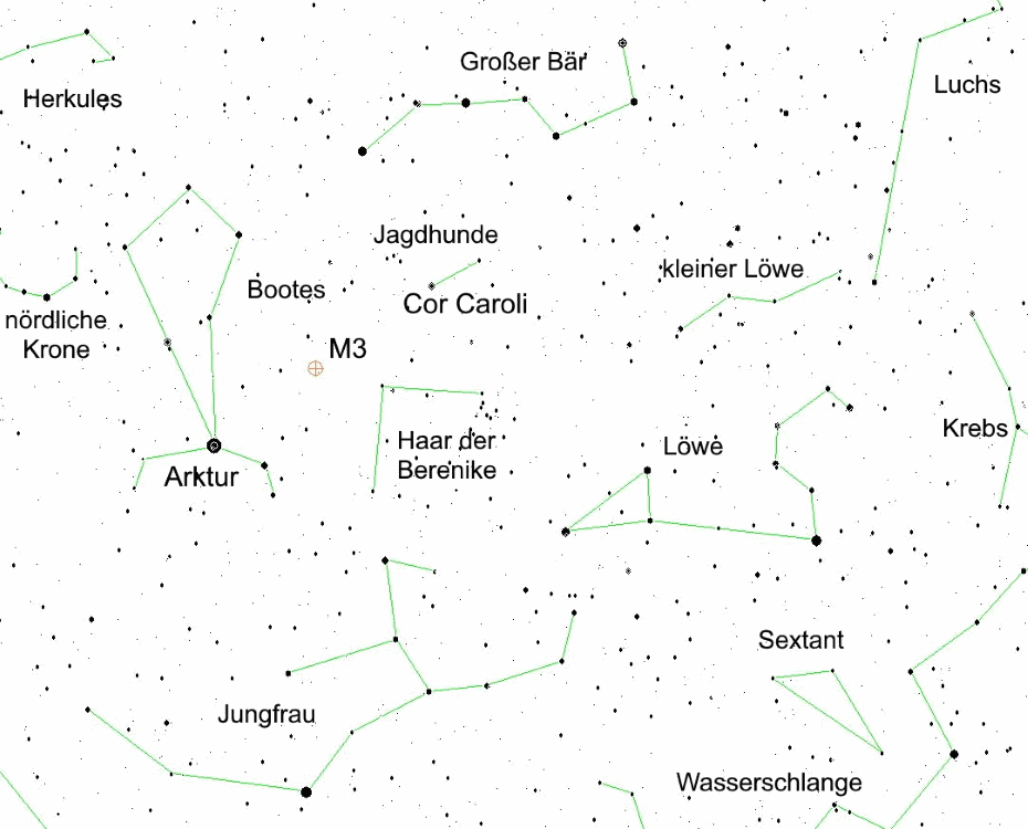 Zu finden ist der prachtvolle Sternhaufen zwischen Arktur, dem Hauptstern im Sternbild Bootes und Cor Caroli im Sternbild Jagdhunde. |