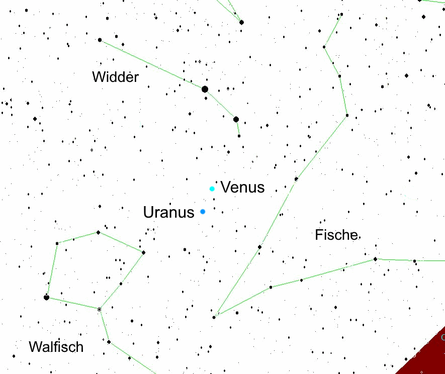 Am Abend des 8. März kann man versuchen, ob Uranus (5,9 mag) im Feldstecher sichtbar ist. Als Hilfe kann an diesem Abend die helle Venus dienen. Venus zieht nur 3 Grad nördlich an Uranus vorbei.