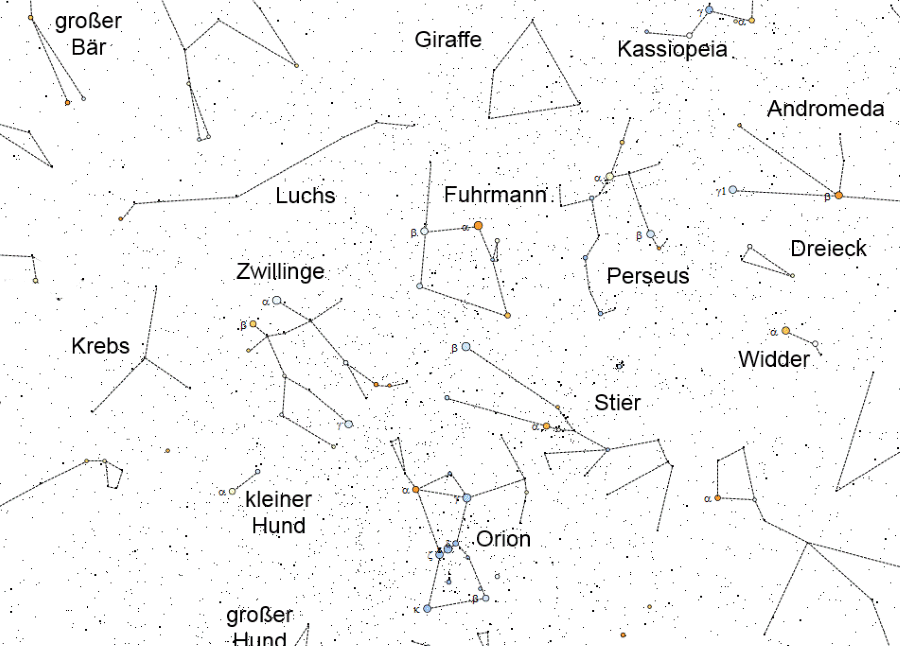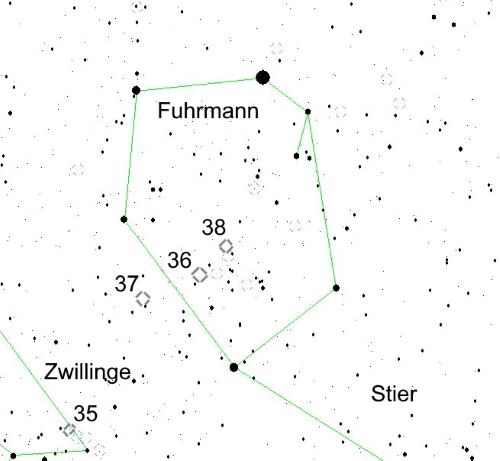 Im Bild ist rechts der offene Sternhaufen Messier 38 (NGC 1912) und unten (südlich) der offene Sternhaufen NGC 1907 zu sehen. Der helle Stern im Bild rechts unten hat eine Helligkeit von 6,3 mag und eine Entfernung von rund 590 Lichtjahren.