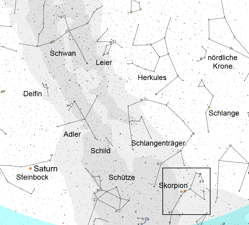 Auffinden des Sternbilds Skorpion, der Rahmen gibt den Ausschnitt der nächsten Karte an. |