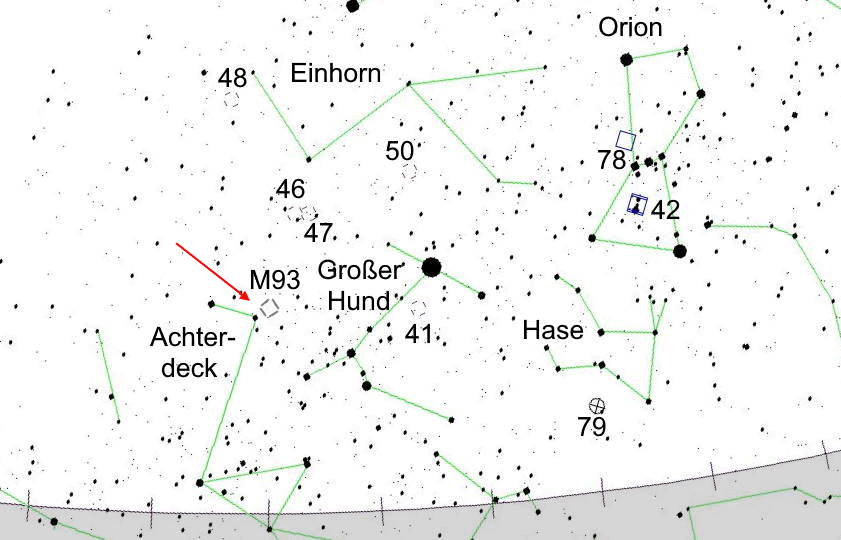 Die Karte oben zeigt den Sternenhimmel Mitte März um 21 Uhr mit Blick Richtung Süden. Eingezeichnet ist neben M93 auch offene Sternhaufen (Kreis), Gasnebel (Rechteck) und ein Kugelsternhaufen (Kreis mit Kreuz). Bezeichnet sind die Objekte mit ihren Nummern im Messier-Katalog. |
