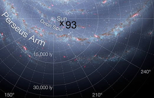 Der Sternhaufen hat eine Helligkeit von 6,2 mag und eine scheinbare Größe von 22 Bogenminuten. Da M93 3600 Lichtjahre von der Sonne entfernt ist, beträgt sein tatsächlicher Durchmesser etwa 20 Lichtjahre. Sein Alter wird auf 100 Millionen Jahre geschätzt. |