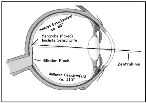 Fixieren wir bei Dunkelheit ein Objekt mit dem Auge, so fällt sein Bild auf den zentralen Bereich der Netzhaut. Die Zapfen dort bekommen möglicherweise nicht genug Licht, um einen Sinnesreiz auszulösen. Deshalb können wir besonders schwache Objekte besser mit den peripher angeordneten Stäbchen erfassen.