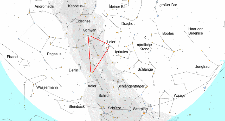 Er kann aber auch auffallende Sterne unterschiedlicher Sternbilder einbeziehen, wie etwa das Sommerdreieck oder das Wintersechseck, deren Sterne sich über einen großen Teil des Himmels verteilen. |