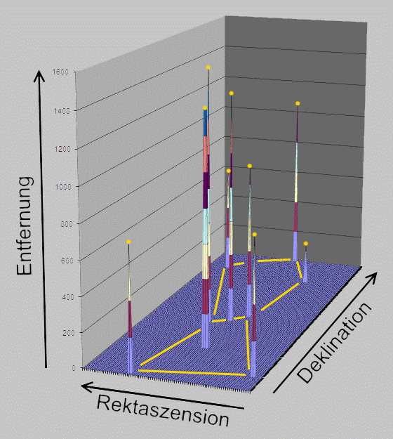 Ein Asterismus kann Teil eines Sternbildes sein und aus benachbarten Sternen bestehen (Beispiele hierfür sind der „Große Wagen“, Orion oder Kassiopeia.) Im Bild sind die Koordinaten der Sterne Rektaszension und Deklination, die dritte Achse ist die Entfernung für das Sternbild Orion eingetragenen. |