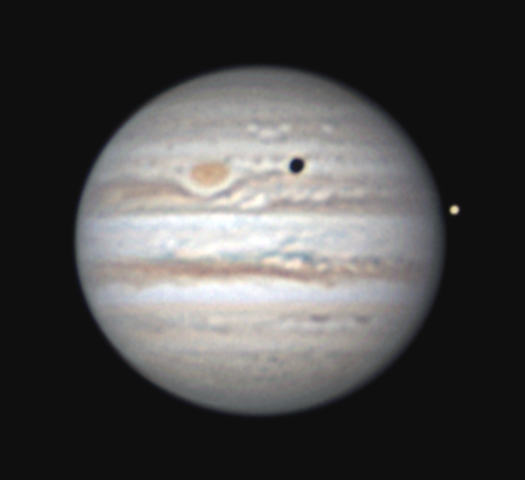 Der Mond neben Jupiter ist Io. Den Schatten neben dem GRF wirft Ganymed. Dieser Mond steht rechts außerhalb des Bildfelds. Die Orientierung in diesem Bild ist wie die Ansicht im Fernrohr, also Norden oben und Osten rechts.