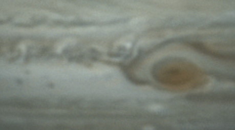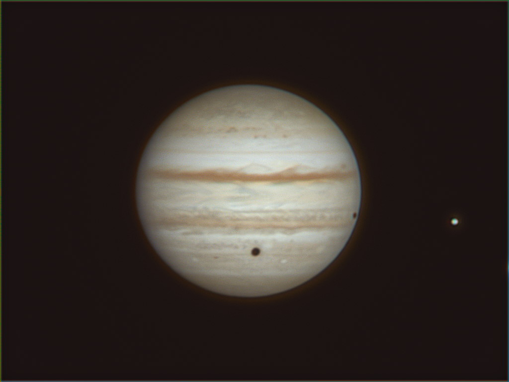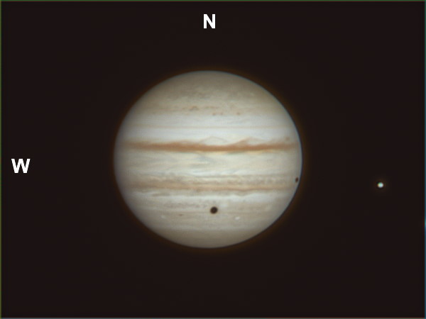 um 2:40 Uhr sind die Schatten der Monde Ganymed und Io zu sehen. Io steht im Bild auf der rechten Seite (Osten).