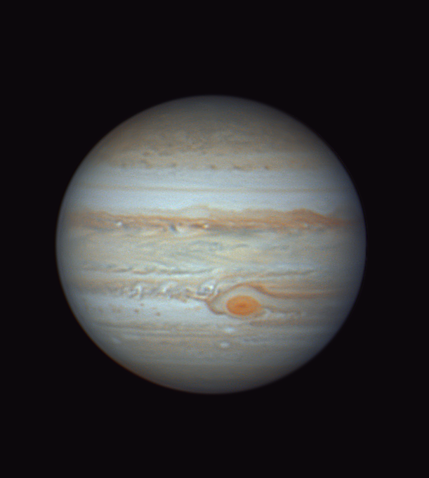 Mit einem Spiegelkasten konnte Jupiter mit einer Farb- und einer schwarzweiĆ- Kamera aufgenommen werden. Nach der Bearbeitung der Bilder sind beide kombiniert worden.