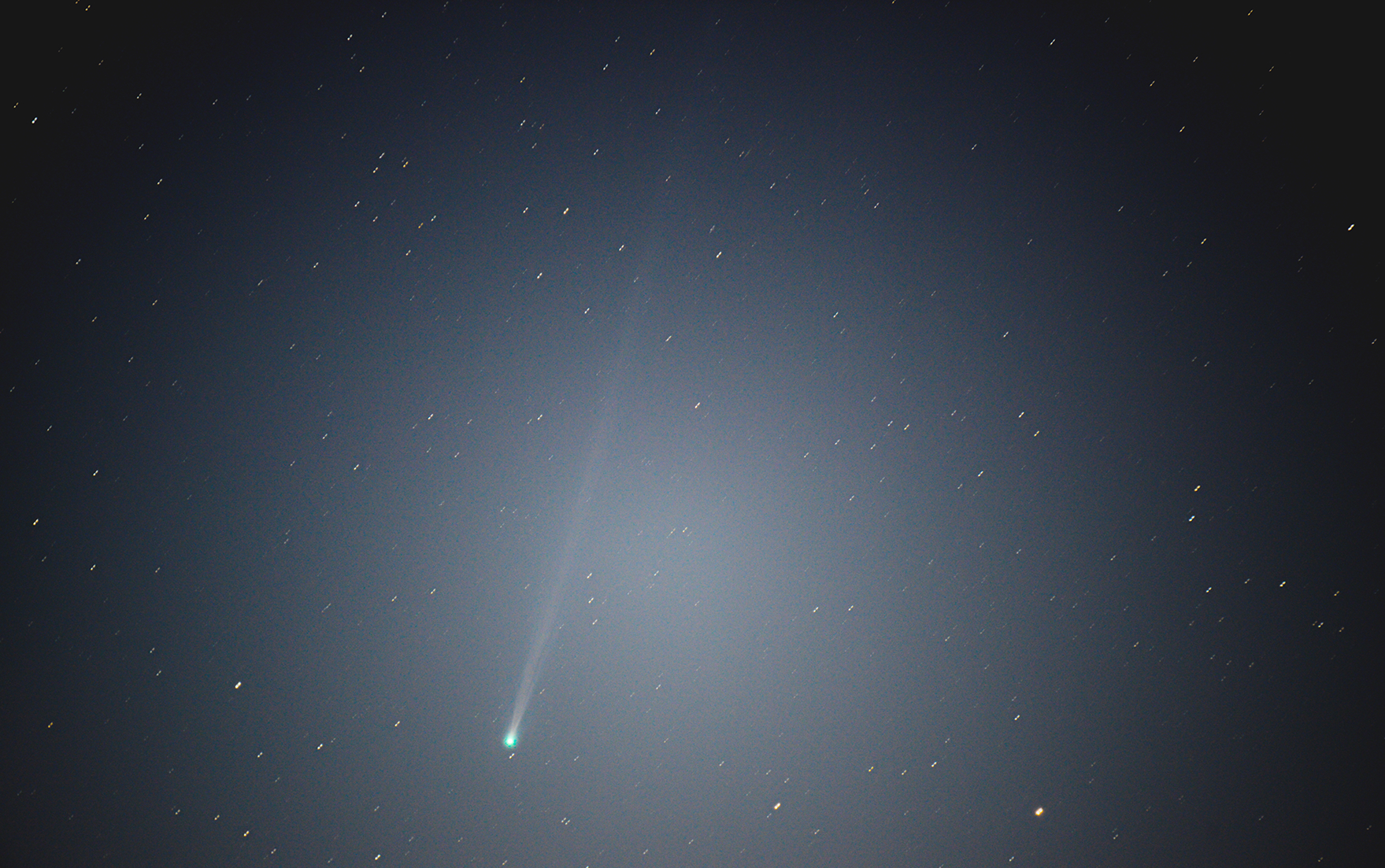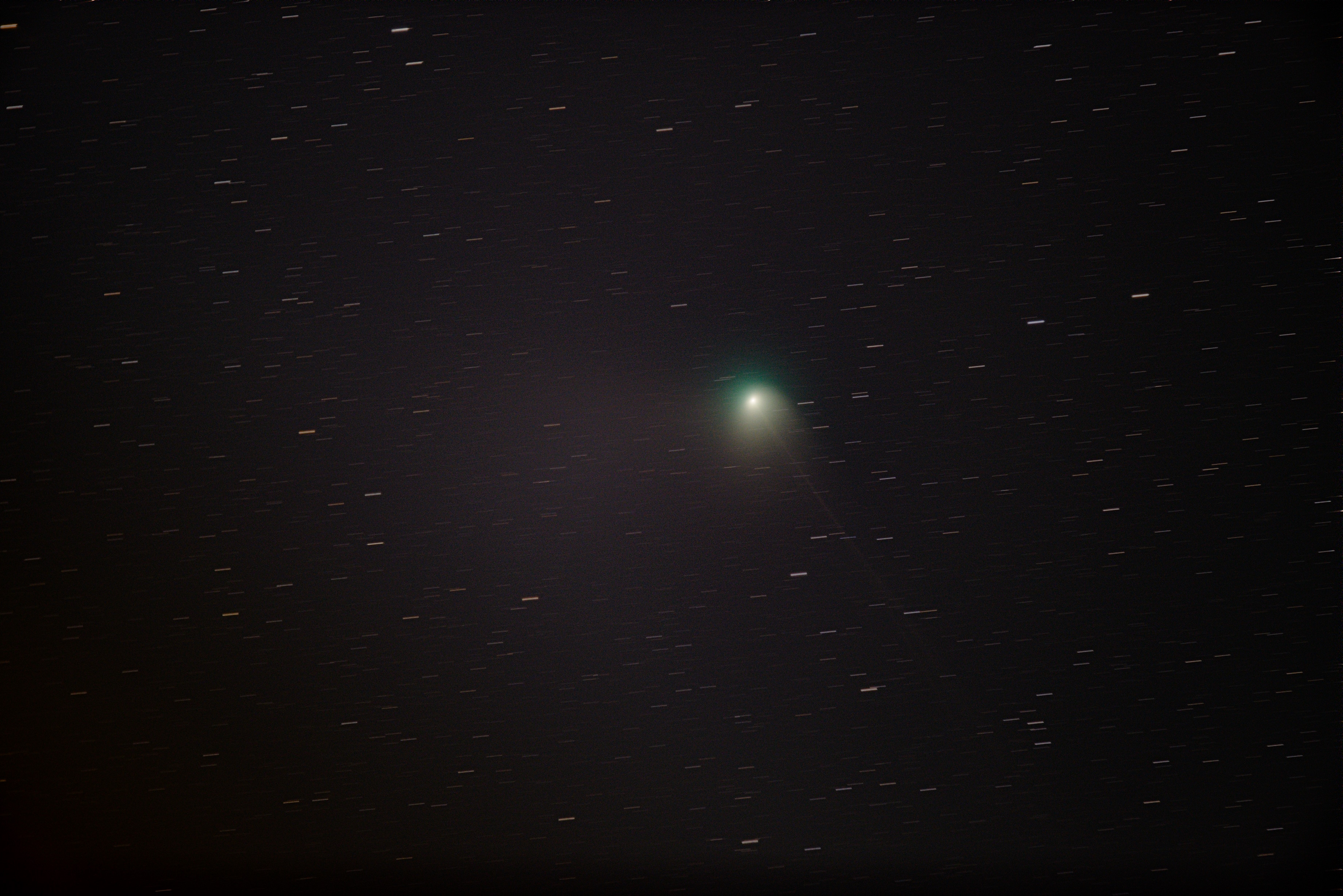 Der Komet bewegt sich auf seiner Bahn um die Sonne (Strichspuren der Sterne). Die Strichspuren sind unterbrochen, denn von den 10 Aufnahmen mussten 2 gelöscht werden. Es waren darauf die Strichspuren von Satelliten.