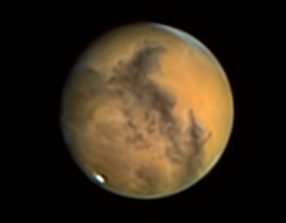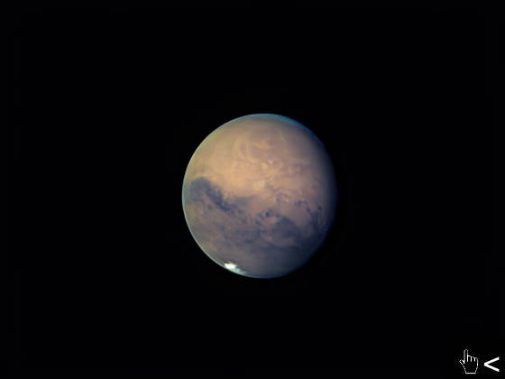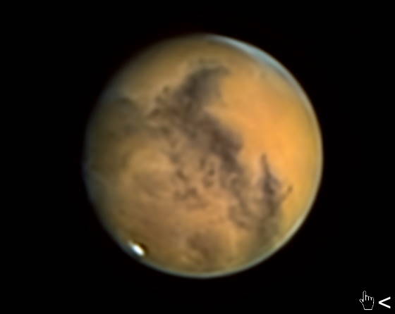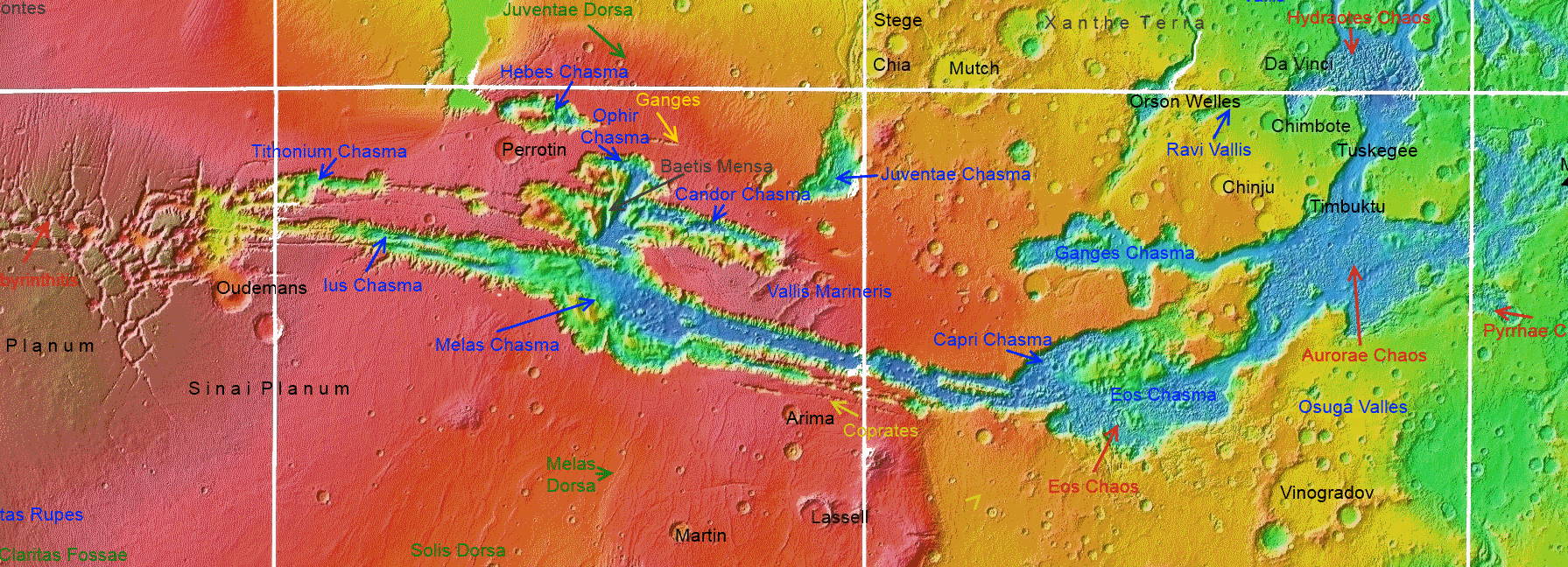 In dem Bild oben ist ein Ausschnitt des Bildes Mars Oberfläche West zu sehen. Gemessen wurde die Breite von Condor Chasma in Google Earth Pro mit 140 Kilometer. (durchgezogene Linie) und die breite Stelle mit 350 Kilometer (punktierte Linie). | ||||||||||||||||